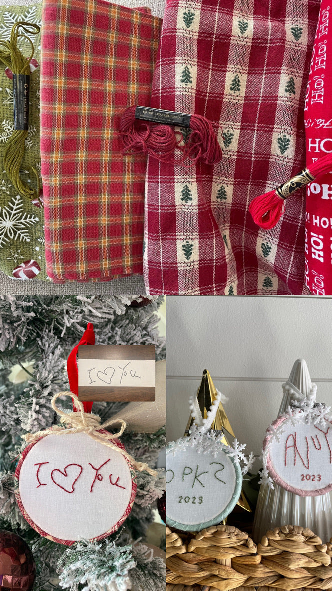 Capture your child’s handwriting in a timeless keepsake. Each ornament is lovingly hand-embroidered to showcase your little one’s own written name, stitched onto soft cotton fabric and framed in a classic wooden embroidery hoop.